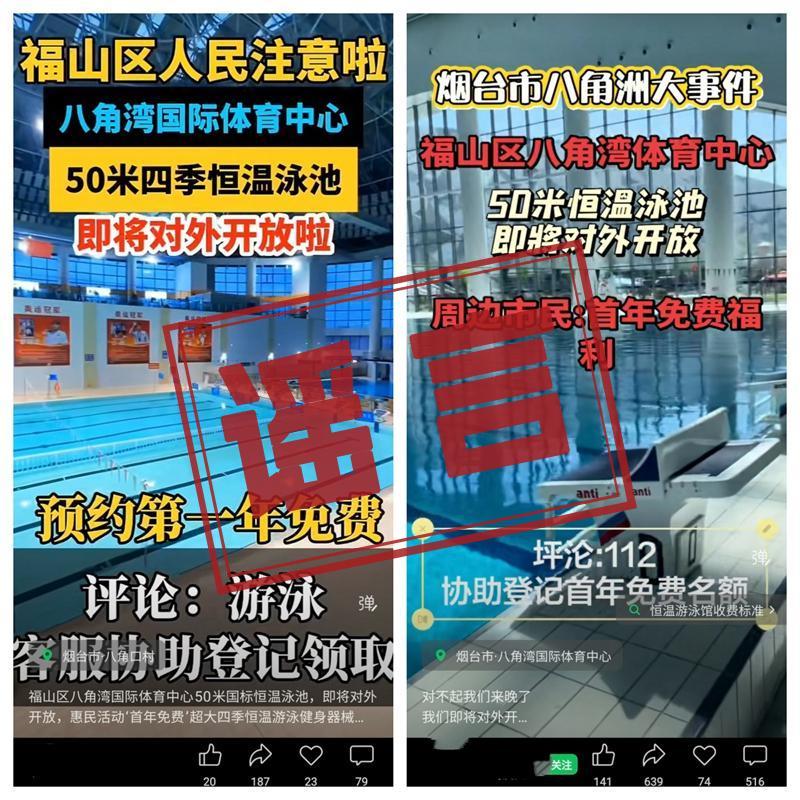 水母网3月9日讯 近日,短视频平台用户发布 “烟台八角湾国际体育中心50 米恒温泳池即将对外开放,评论、转发、分享相关信息可享首年免费”等内容,引发关注和讨论。经向有关部门单位核实,“游泳馆首年免费” 属于虚假信息。
